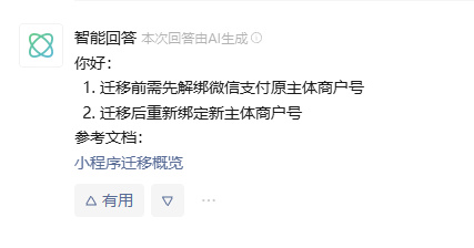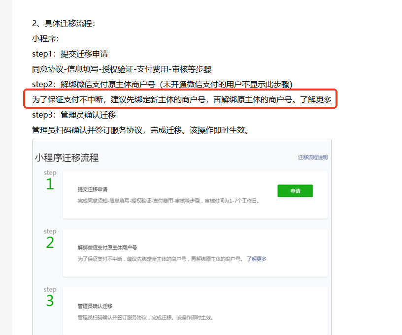 你好!之前提了关于小程序主体迁移过程中的问题,您回复说:迁移前需先解绑微信支付原主体商户号,迁移后重新绑定新主体商户号,并且给了我一个链接:https://developers.weixin.qq.com/community/develop/doc/00068ad6d44598bf0989e84ba56c09。