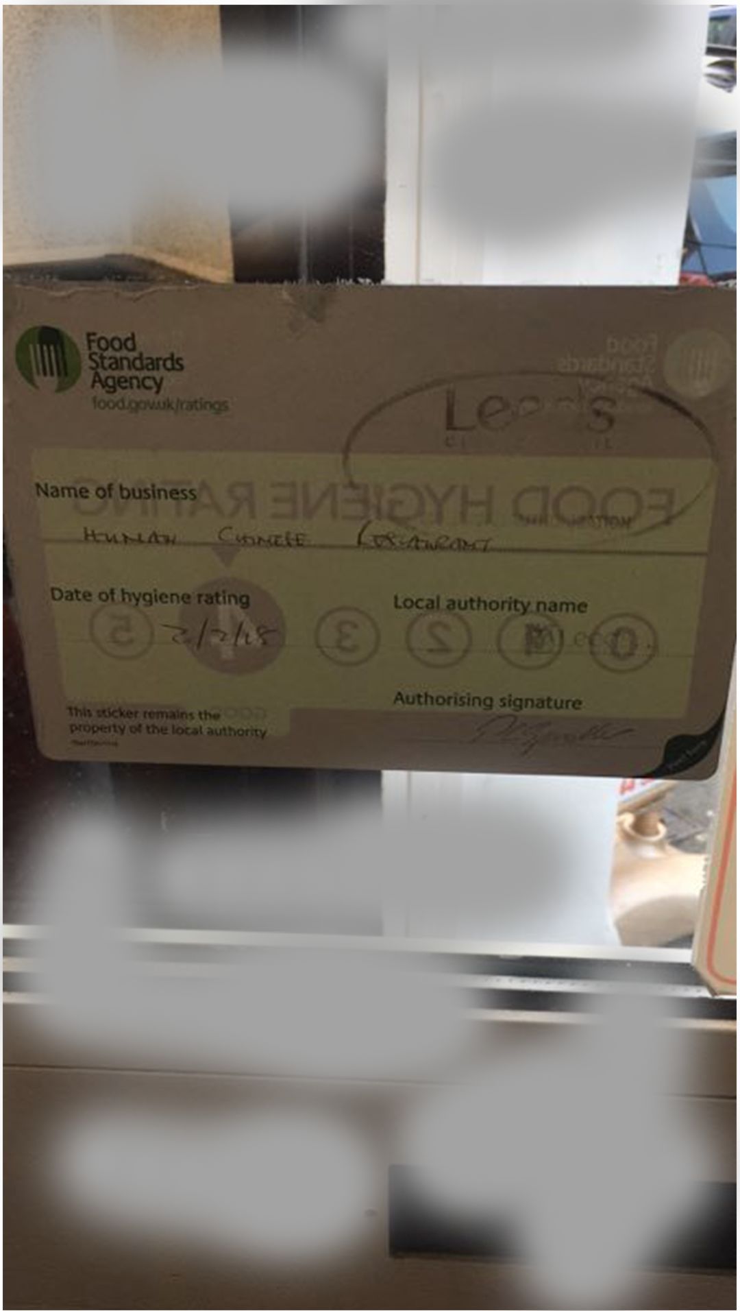 目前公司为一名英国餐馆的客户开发小程序,小程序需要餐饮服务场所类目的资质,通过该类目需要卫生许可证,但是由于英国国情问题,只能提供个卫生健康许可证,而且许可证都是直接贴在门上的,没法再撕下来制作复印件,下面是店面和许可证的正背面。