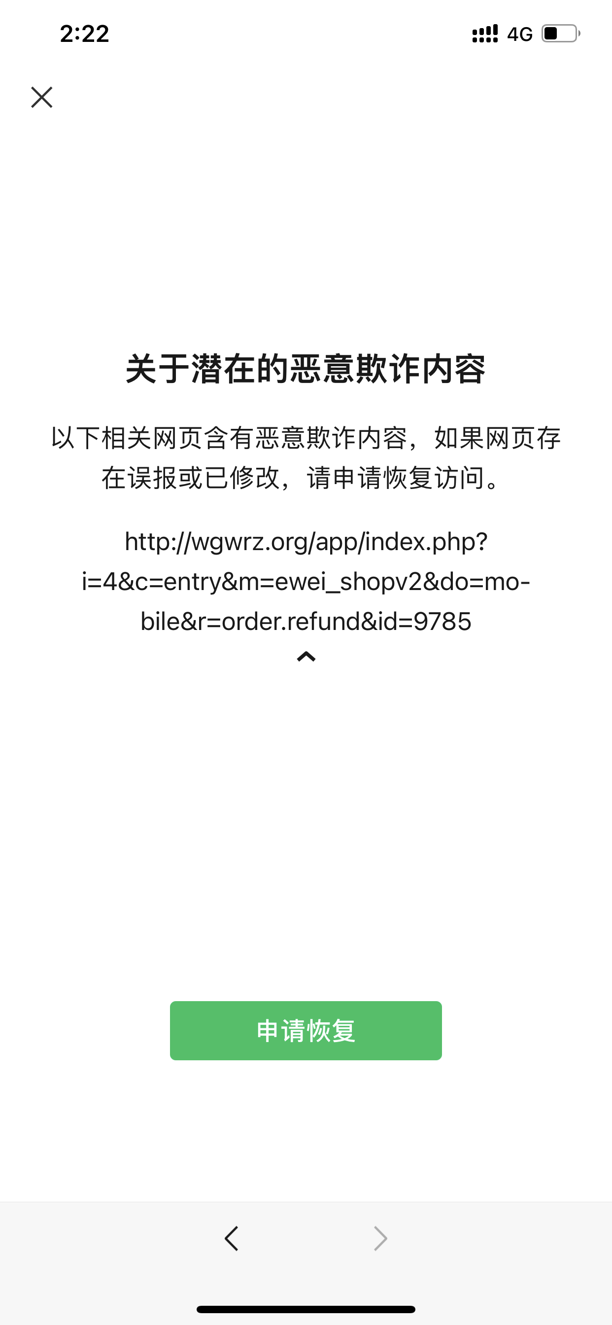 你好,经核实域名wgwrz.org下的链接【http://wgwrz.org/app/index.php?i=4&c=entry&m=ewei_shopv2&do=mobile&r=order.refund&id=9785】的违规内容已经修改,现已恢复微信内直接访问的服务,请知悉。