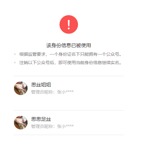 实名认证的时候,发现被两个公众号占用了,无法注册和注销那个占用我个人信息的公众号的对方,我是第一册注册使用
