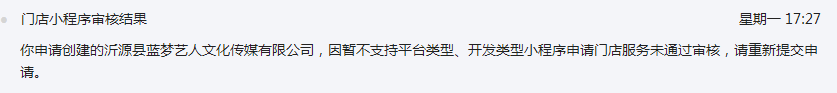 我公司2018年9月19日啥呢和通过,添加门店小程序,门店功能,添加门店审核,与2018年9月19日审核成功,后期在2018年10月份删除过一次门店,10月22日再次添加门店审核一直显示失败,什么原因?公众号没有违法违规和设置变动,一直到20月31日,提交审核5-6次一直显示 " 因暂不支持平台类型、开发类型小程序申请门店服务未通过审核,请重新提交申请。" 或者是 ” 因门店名称/照片/视频与服务类目不相关,请修改服务类目后重新提交未通过审核,请重新提交申请。“