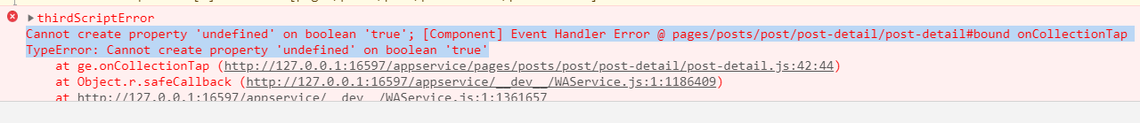 Cannot create property 'undefined' on boolean 'true'; [Component] Event Handler Error @ pages/posts/post/post-detail/post-detail#bound onCollectionTap