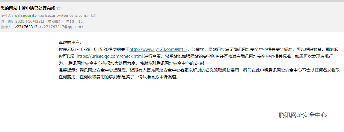 今天(2021年10月28日)在【腾讯安全-安全网址中心】申诉已通过。