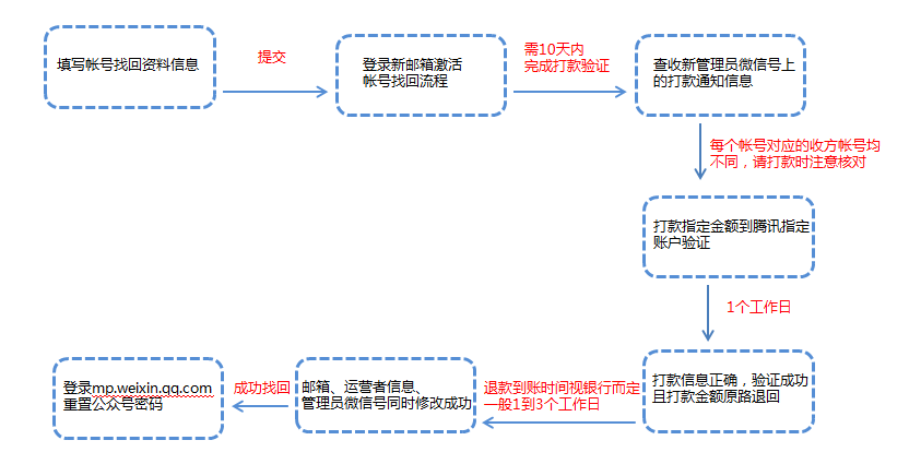 第三步【打款验证】:使用找回帐号时填写的对公帐号向腾讯指定账户进行指定金额打款(需在10天内完成打款),若打款信息正确则在1个 工作日左右推送验证结果至管理员微信号上,且所打款的金额将在3个工作日内原路退还到对公账户上;