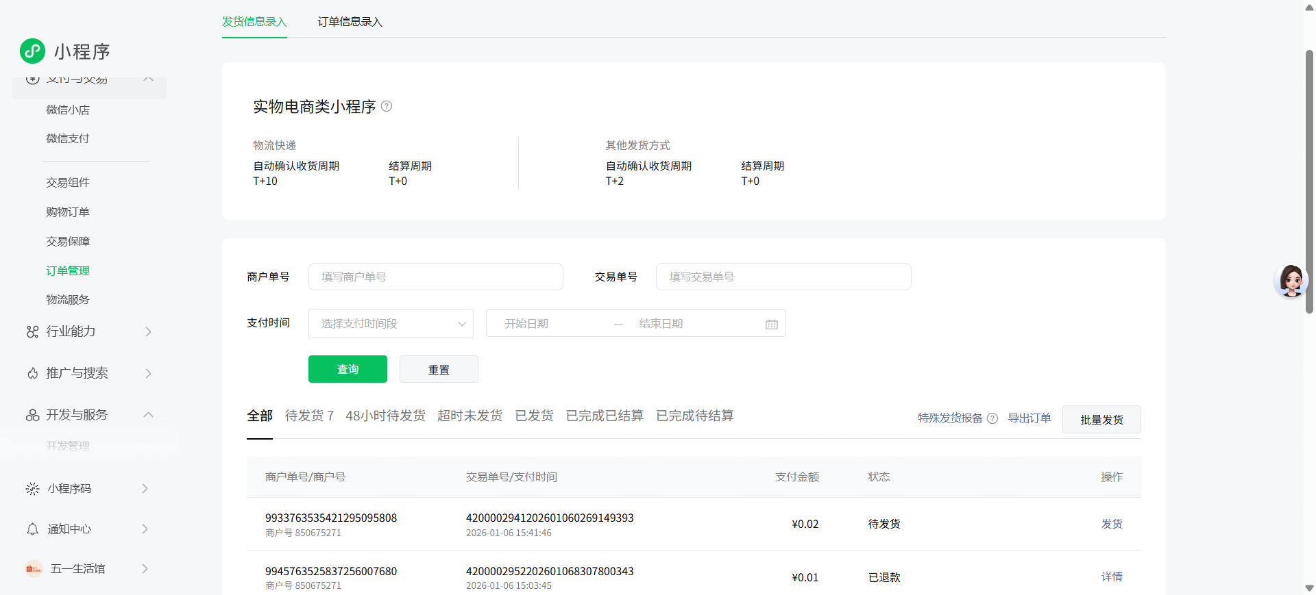 【请求参数】:{"order_key":{"mchid":"531000025608981","order_number_type":1,"out_trade_no":"9933763535421295095808"},"payer":{"openid":"oOtBq11T_Ydc6gsjnIUsHyOyRTQ8"},"sub_orders":[{"delivery_mode":2,"is_all_delivered":true,"logistics_type":1,"order_key":{"mchid":"531000025608981","order_number_type":1,"out_trade_no":"OTEST20260106000019"}}],"upload_time":"2026-01-06 17:56:19"}