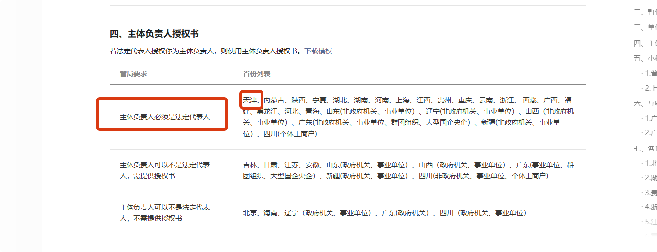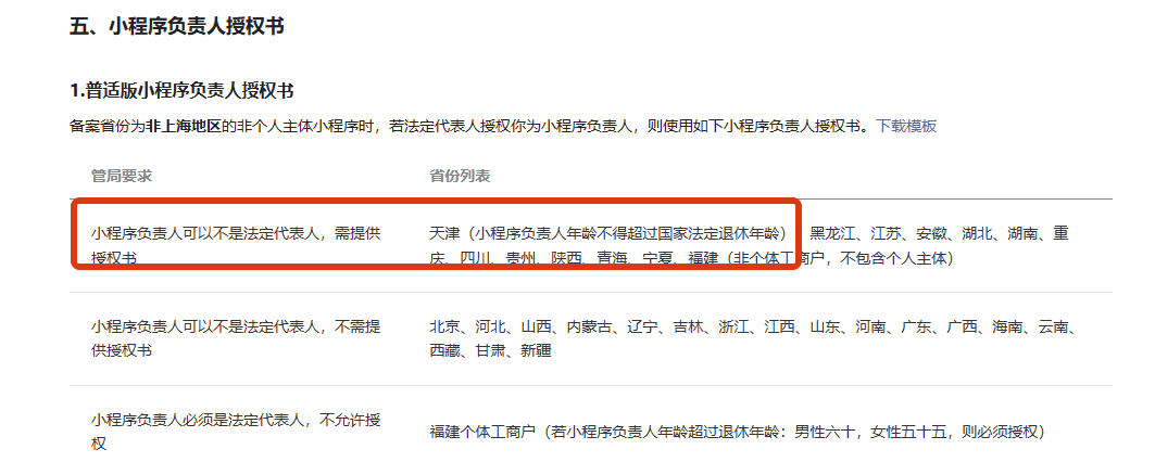 然后在(五、小程序负责人授权书)小程序负责人可以不是法定代表人,需提供授权书这里天津又是可以授权的;