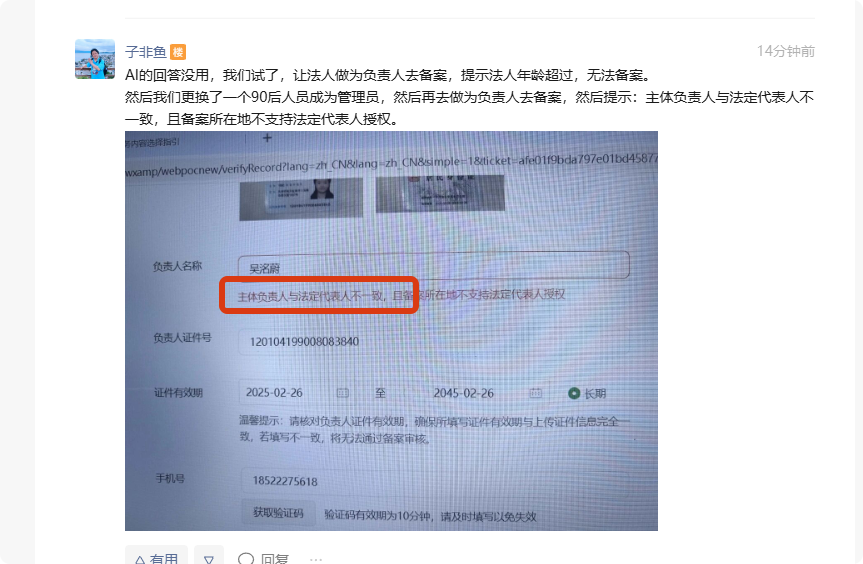 AI的回答没用,我们试了,让法人做为负责人去备案,提示法人年龄超过,无法备案。