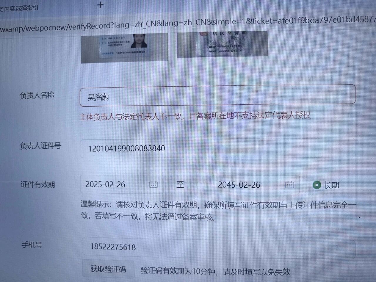 一、天津地区备案主体负责人和小程序负责人可以不为同一个人,请注意区分当前负责人界面填写的信息是否正确(小程序负责人需与管理员一致);