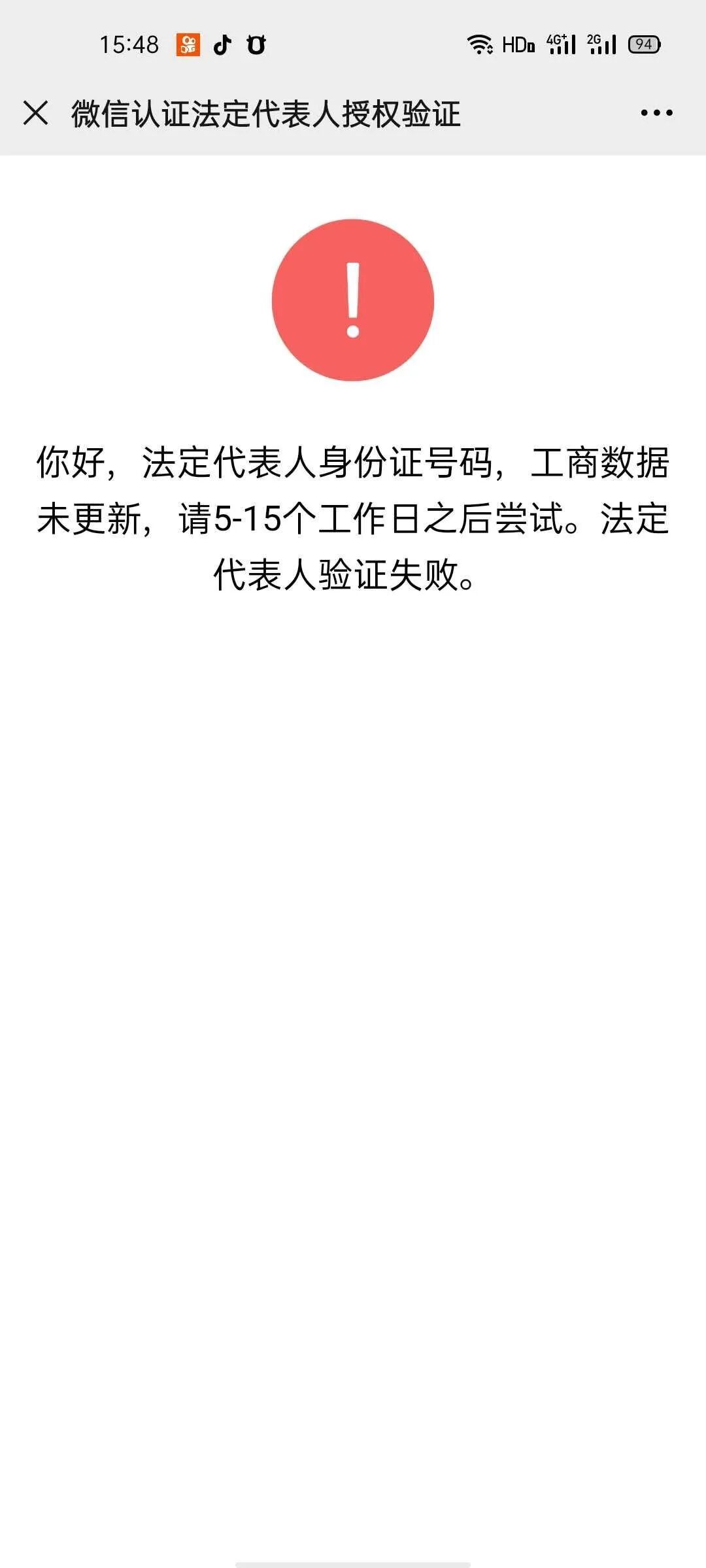 微信公众号认证提示身份证号码工商局数据未更新是怎么回事?注册个体工商户时间有1个月多了