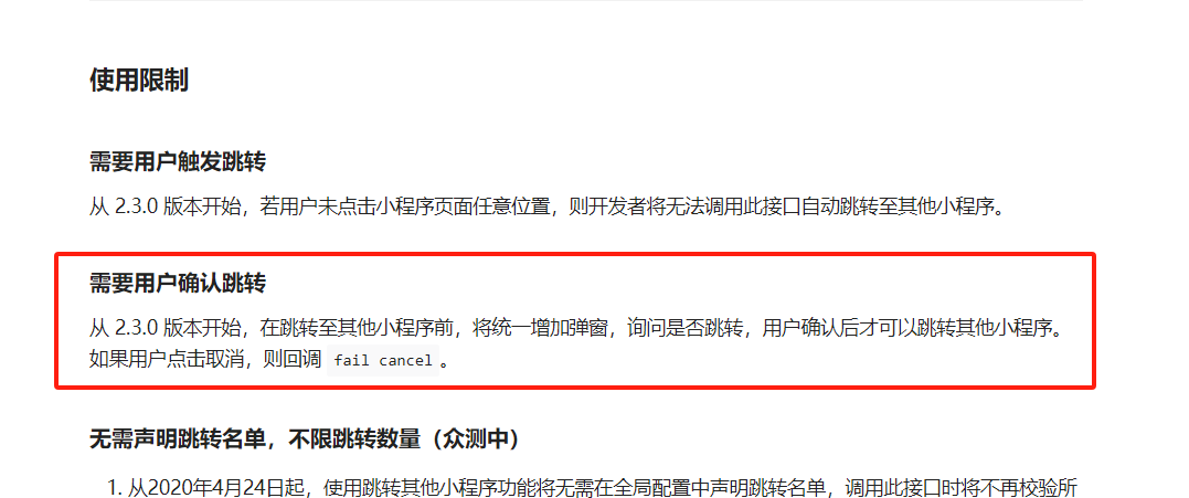 目前小程序互跳都必须主动确认,如果跳转后只是进行一些简单的业务逻辑,可以考虑使用半屏小程序打开,这种方式目前不需要确认,但是功能上有一定限制