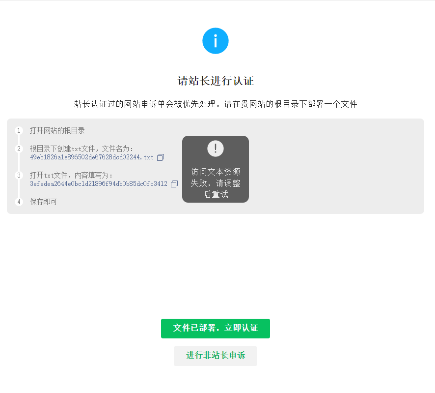 微信工作人员您好,我今日新购买一域名www.yxziyuan.com,准备建立个人博客网站,但发现在微信中被拦截,我按照解封引导进行认证,部署好文件后点击文件已部署,立即认证提示访问文本资源失败,请调整后重试