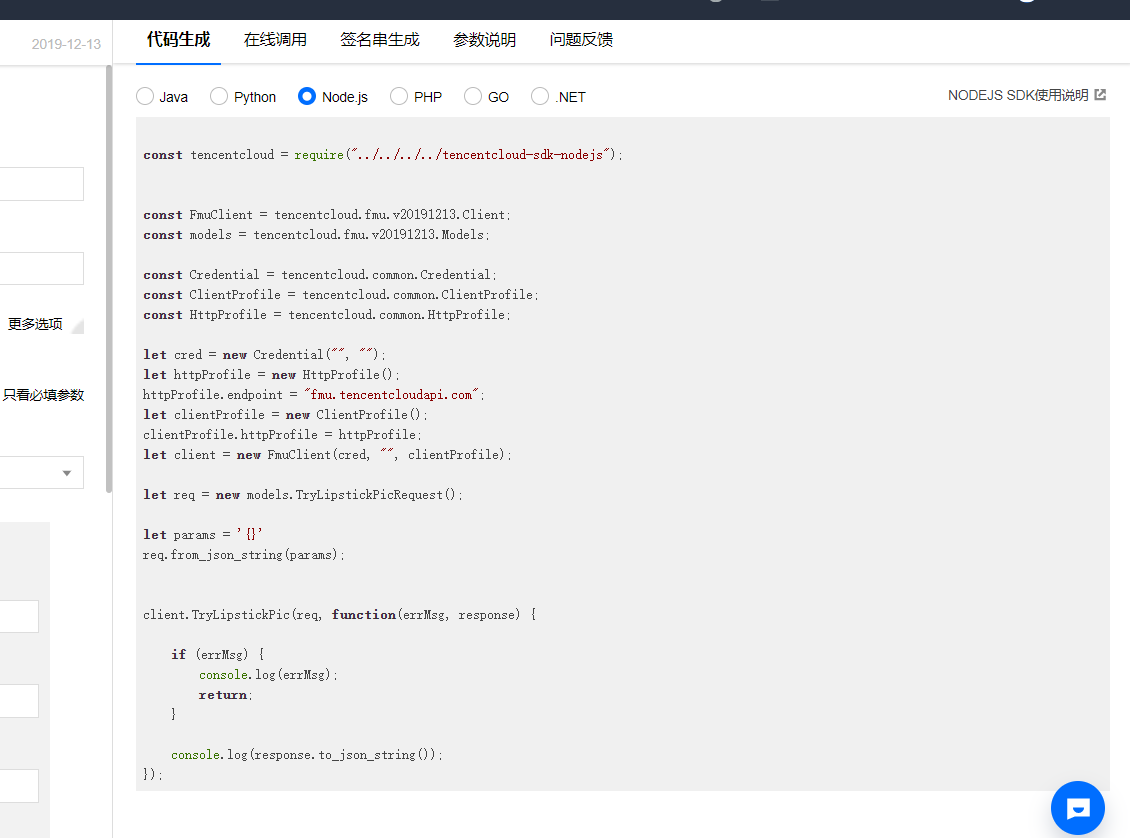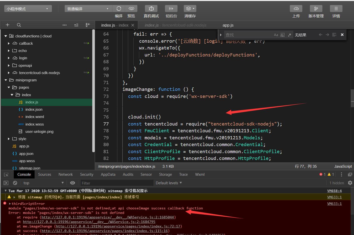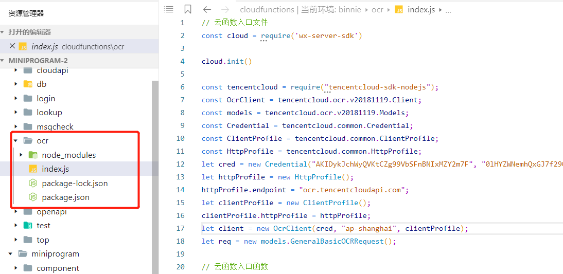 // 云函数入口文件 const cloud = require('wx-server-sdk') cloud.init() const tencentcloud = require("tencentcloud-sdk-nodejs"); const OcrClient = tencentcloud.ocr.v20181119.Client; const models = tencentcloud.ocr.v20181119.Models; const Credential = tencentcloud.common.Credential; const ClientProfile = tencentcloud.common.ClientProfile; const HttpProfile = tencentcloud.common.HttpProfile; let cred = new Credential("", ""); let httpProfile = new HttpProfile(); httpProfile.endpoint = "ocr.tencentcloudapi.com"; let clientProfile = new ClientProfile(); clientProfile.httpProfile = httpProfile; let client = new OcrClient(cred, "ap-shanghai", clientProfile); let req = new models.GeneralBasicOCRRequest(); // 云函数入口函数 exports.main = async(event, context) => { const { base64 } = event; let params = `{"ImageBase64":"${base64}"}`; req.from_json_string(params); return new Promise((resolve, reject) => { client.GeneralBasicOCR(req, function (errMsg, response) { if (errMsg) { console.log(errMsg); reject(errMsg); return; } resolve(response.to_json_string()) }); }); }路径引用错误。找不到这个nodejs。你看下你是不是../少写还是多写了