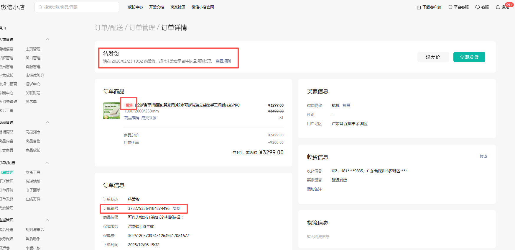 本人是微信小店平台商家,店铺名为“飞哥床垫工厂”,主营大件床垫。由于商品生产周期长,客户装修耗时长等因素,本人依据平台规则,为相关商品合法设定了80天的预售期。