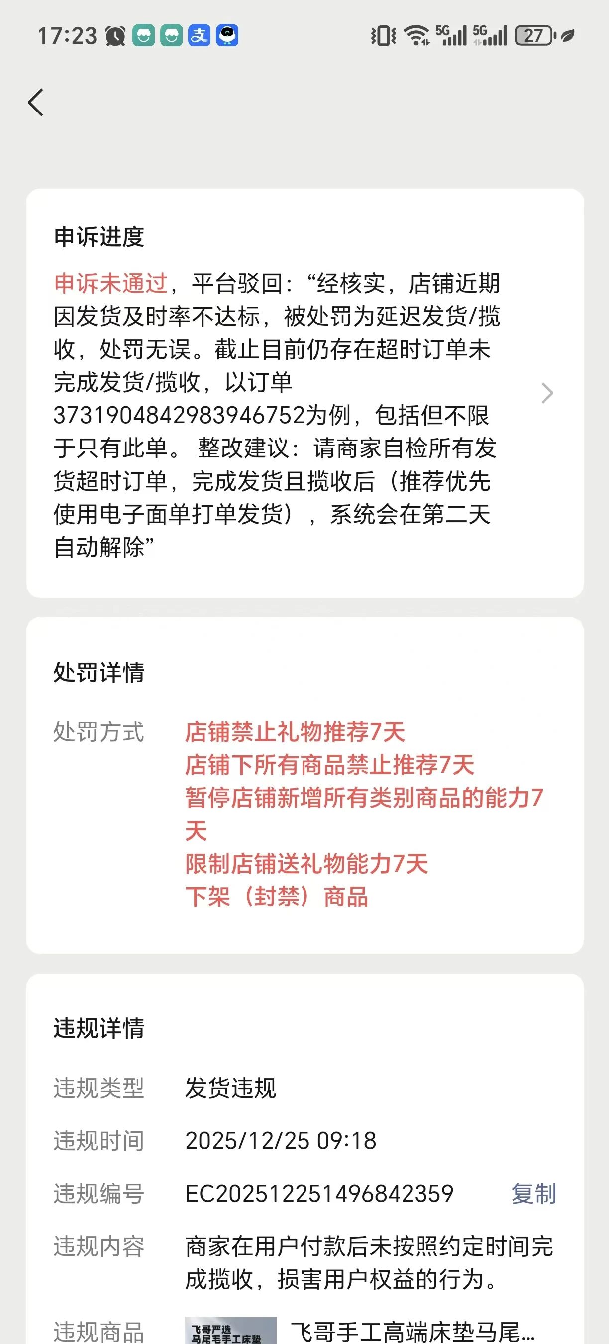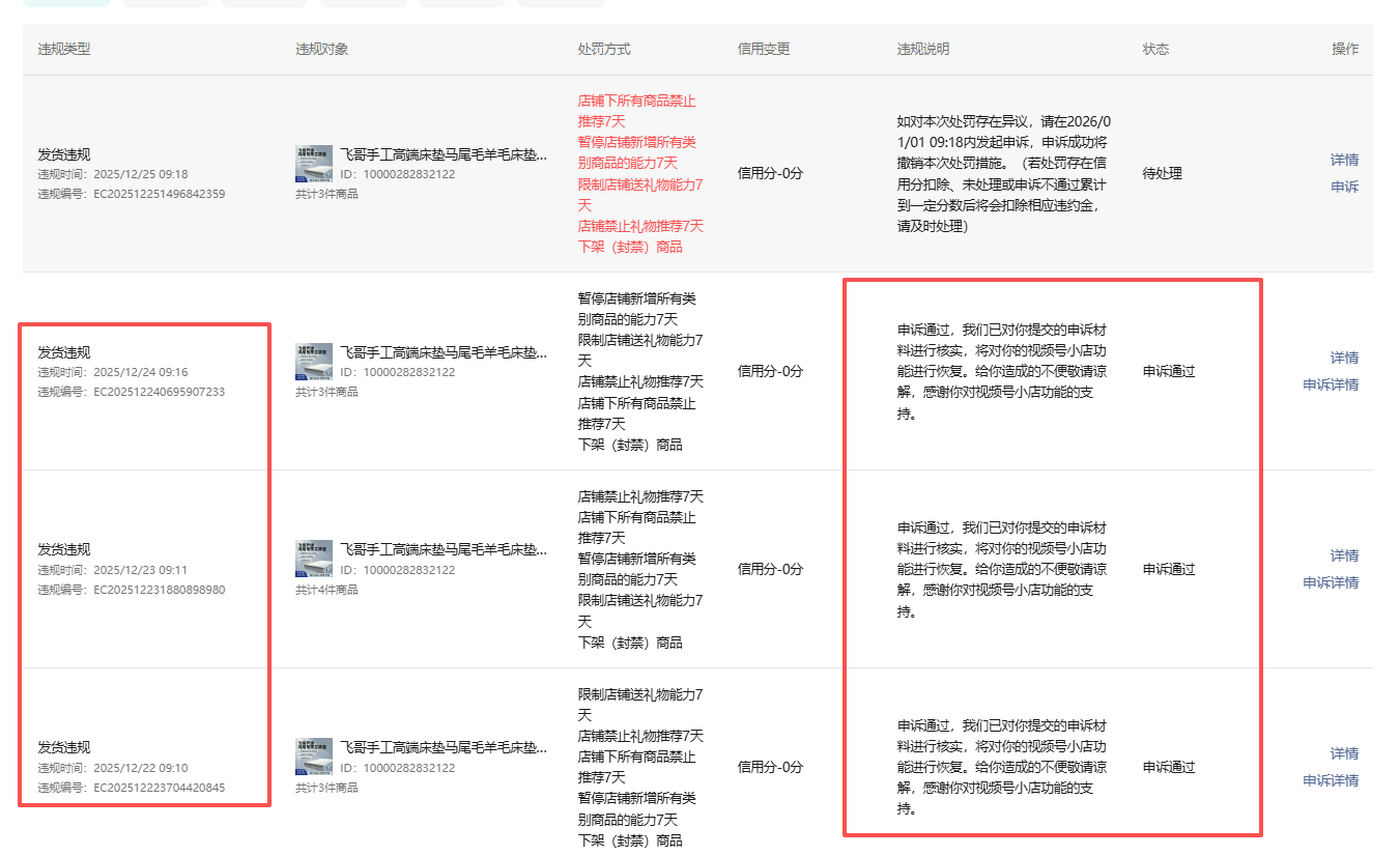官方您好,本店从12月21日起接到违规发货处罚通知,我们当天便进行了申诉并成功通过申诉,后续又重复接到同样的处罚通知,都也申诉通过。经过我们多次仔细的核验,小店没有延期未发货、物流异常、超时未揽收等订单。小店4.94高分经营,近三十天揽收率也是百分百,请平台撤销处罚。