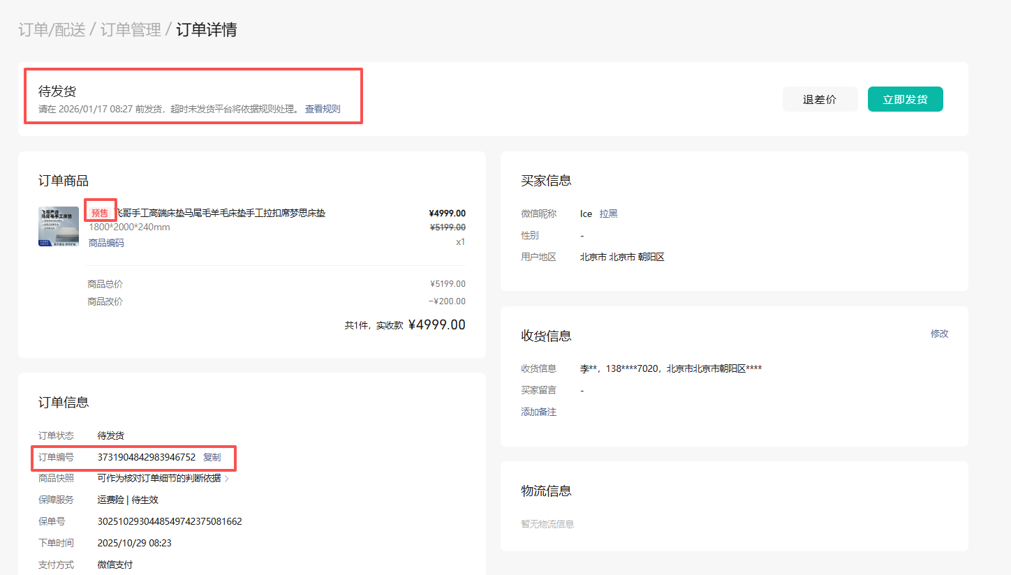 如,平台判罚的订单,3731904842983946752,这个订单是80天预售,用户2025年10月29日下单,系统显示“请在2026/01/17 08:27前发货,超时未发货平台将依据规则处理”,目前订单也在合理时效内,并平台判定为延期发货。