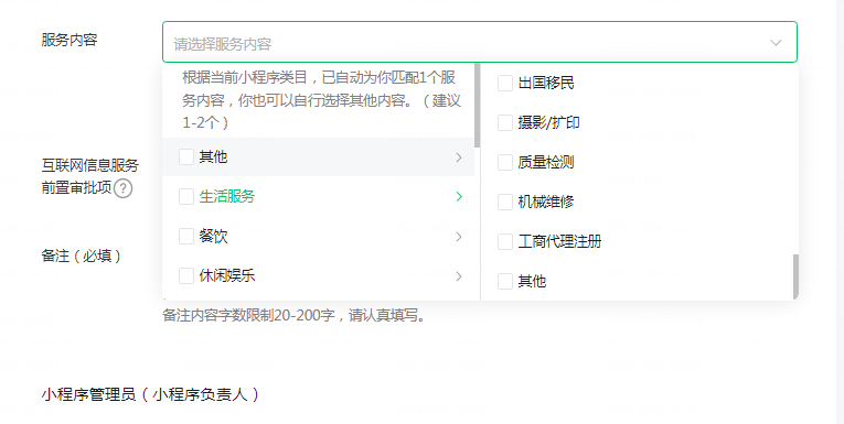 你好,小程序备案服务内容建议根据备案小程序实际从事运营内容尽可能选择相近的服务内容进行备案。详情请参考:https://developers.weixin.qq.com/miniprogram/product/record/receord_category.html