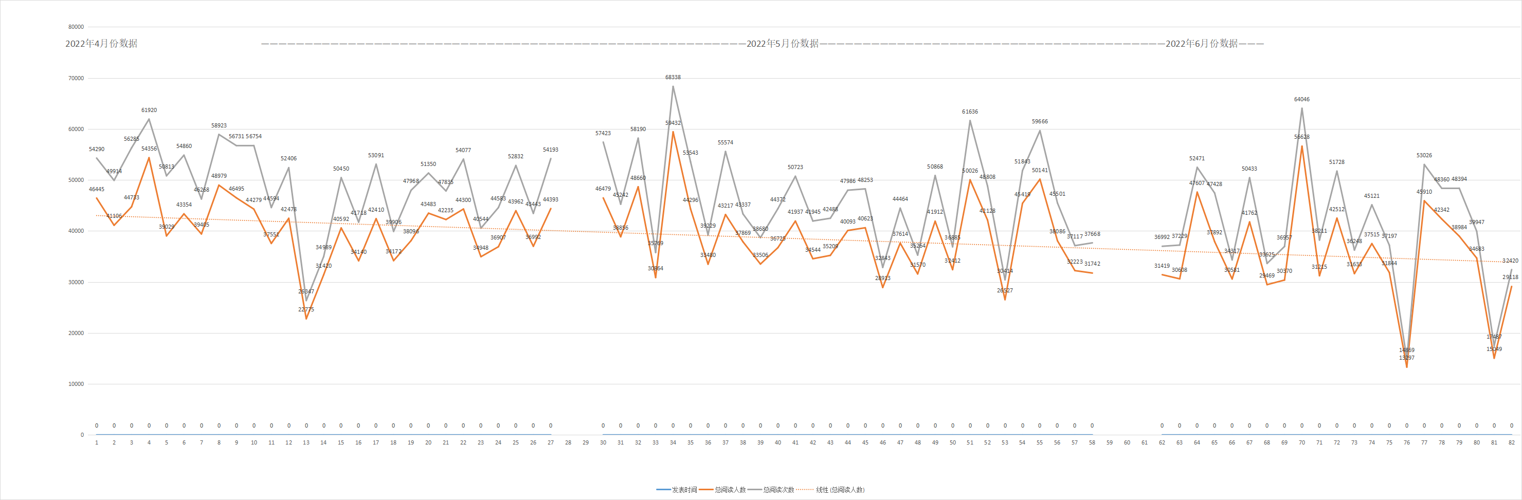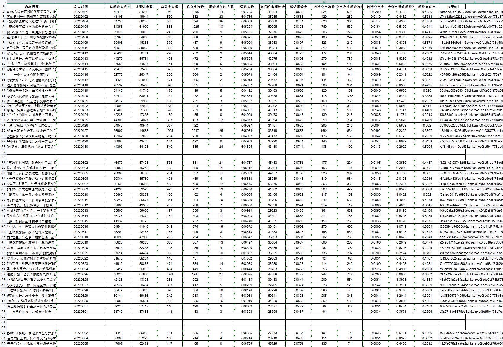 导出了公众号4月到6月的所有的头条文章阅读,看出整个的趋势线整体下降,原创内容跟以前发布的没太大的区别的,但是现在的极低低到完全无法接受。实际粉丝是有增长的,但是阅读持续走低,内容无太大的改变,是否是限流有办法解决?