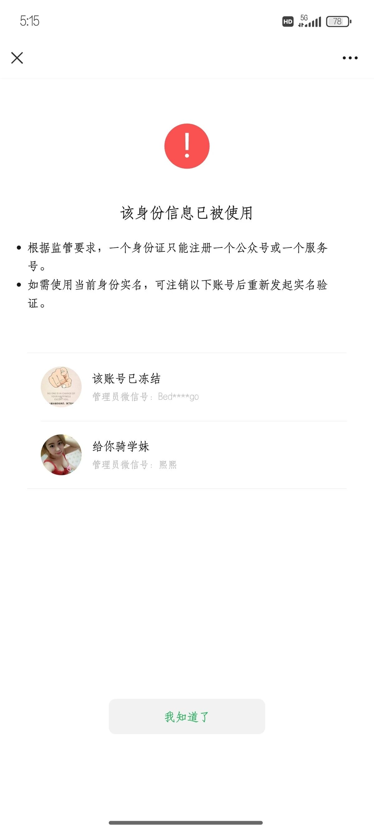 刚注册的公众号,提示要求实名认证,结果自己的身份信息被别人用了,我实名认证不了了,申请解绑