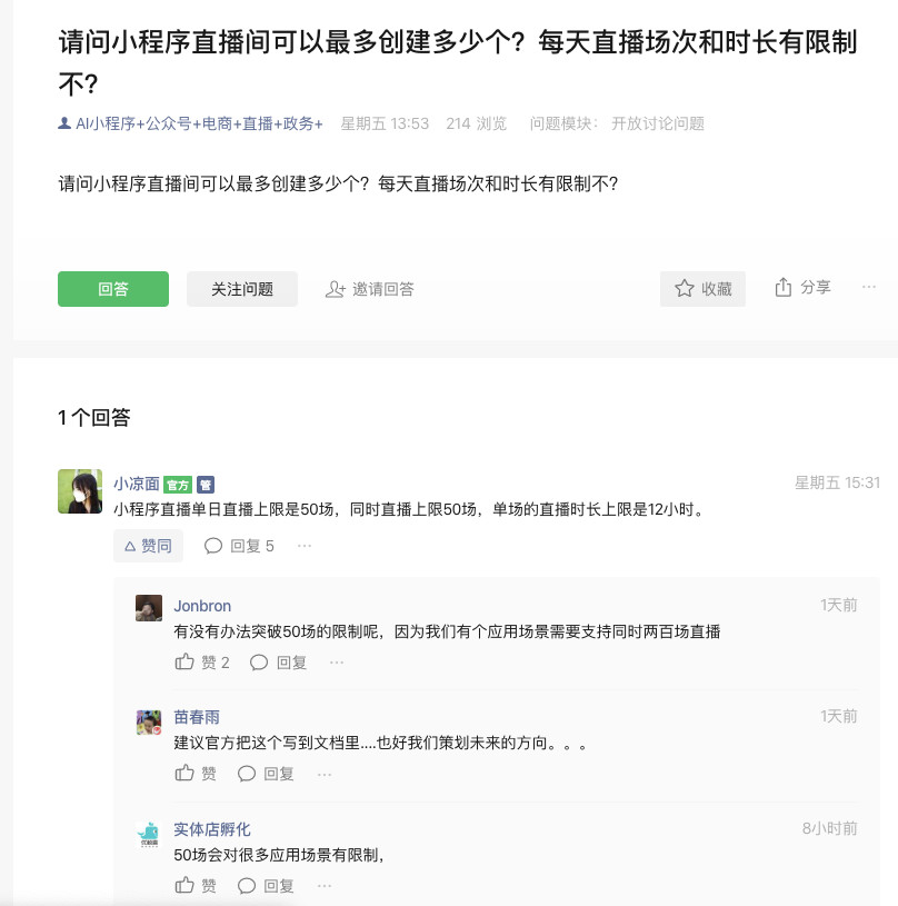 小程序直播后台配置的直播间有个数限制吗?目前已知的是开播上限是50。那我后台提前配置好200个直播间(不是同一天开播)会收限制吗