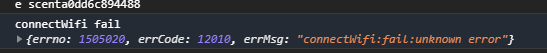 0:859 ❌ Wi-Fi连接失败(第2次,已用时5.058秒): {errno: 1505020, errCode: 12010, errMsg: "connectWifi:fail:unknown error"}