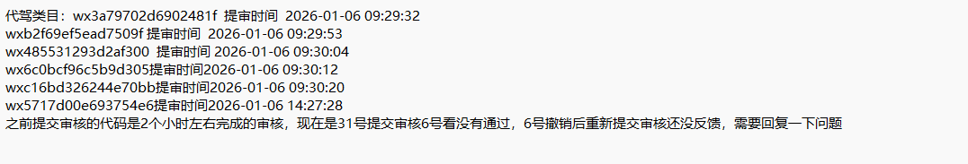 | 代驾类目:wx3a79702d6902481f 提审时间 2026-01-06 09:29:32 wxb2f69ef5ead7509f 提审时间 2026-01-06 09:29:53 wx485531293d2af300 提审时间 2026-01-06 09:30:04 wx6c0bcf96c5b9d305提审时间2026-01-06 09:30:12 wxc16bd326244e70bb提审时间2026-01-06 09:30:20 wx5717d00e693754e6提审时间2026-01-06 14:27:28 之前提交审核的代码是2个小时左右完成的审核,现在是31号提交审核6号看没有通过,6号撤销后重新提交审核还没反馈,需要回复一下问题 |