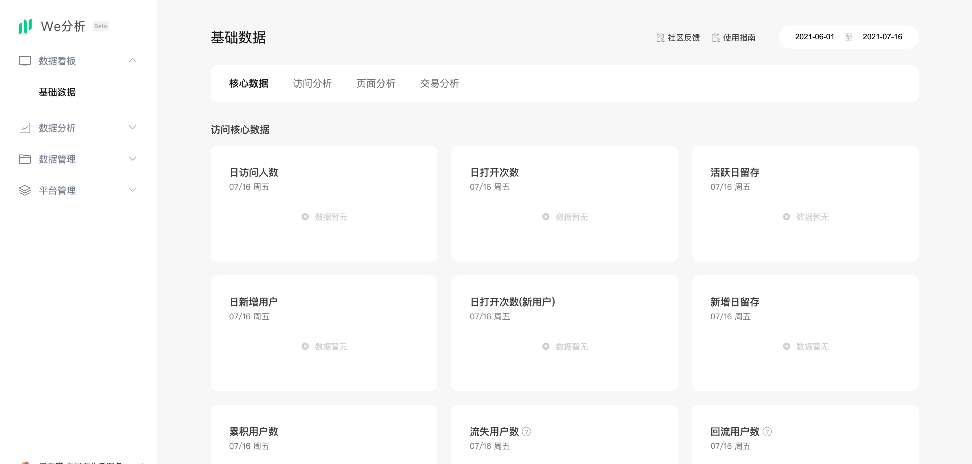 以前内测的时候申请开通过,后面公测的时候应该是被清空了,扫码登录没有这个小程序的选项,然后又在微分析的登录页面左侧扫码开通了,开了好多天了都没有数据,每天的页面都是空数据!其他小程序开通没有遇到这种情况。