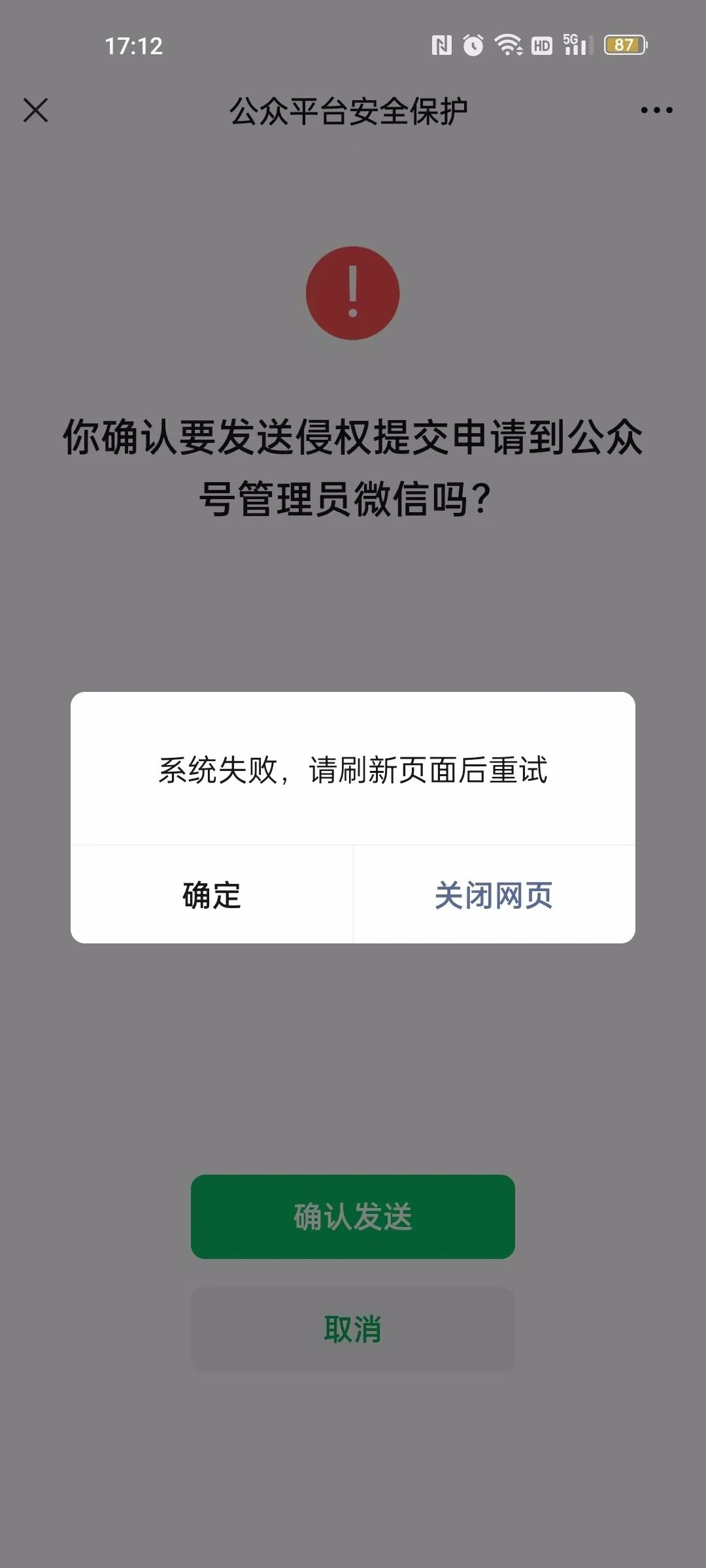 我司发现,有公众号与我司的品牌重合度较高,可能会误导消费者,要申请撤销其公众号。但是,申诉后,扫码出错,不能提交。