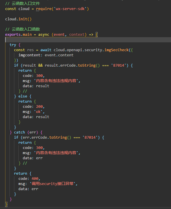 {"errMsg":"cloud.callFunction:ok","result":{"code":400,"msg":"调用security接口异常","data":{"errCode":44004,"errMsg":"openapi.security.msgSecCheck:fail empty content hint: [ZeocqFwgE-Rz5GEa]"}},"requestID":"fd006611-a14e-11ea-868e-525400ce4ad1"}