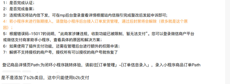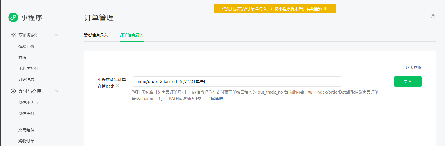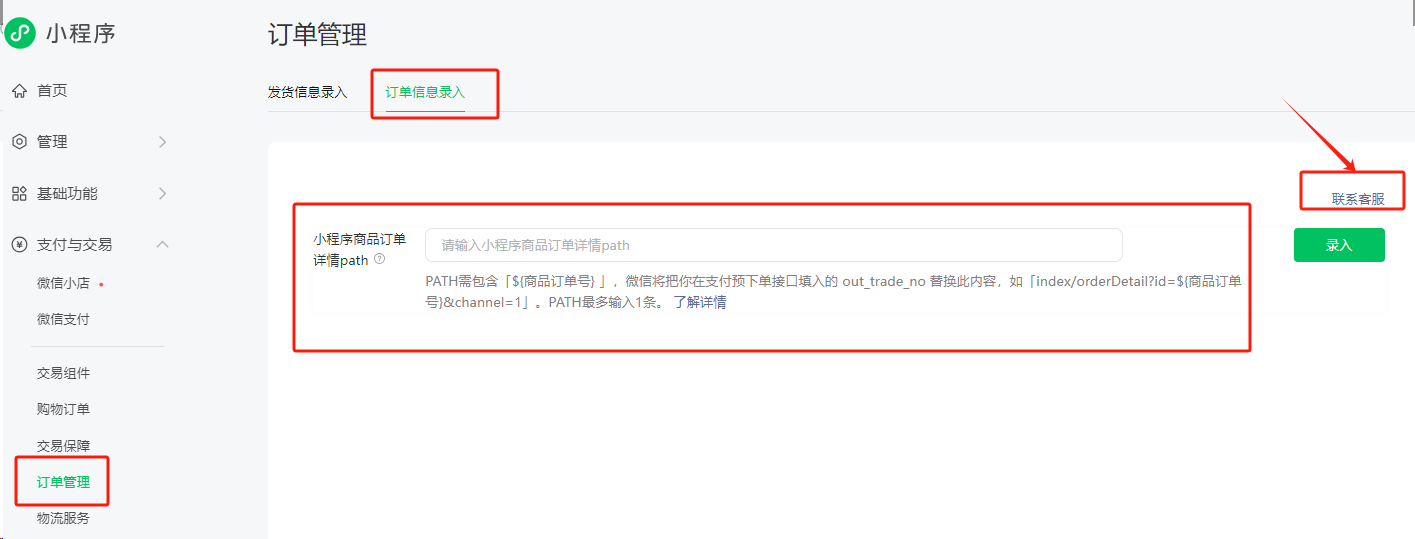 小程序未接入账期,小程序后台,【支付与交易】-【订单管理】-【订单信息录入】,填写订单路径就行了,审核后解封;录入上方就是【联系客服】按钮,有疑问可以联系客服。