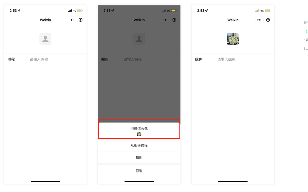 需要将 button 组件 open-type 的值设置为 chooseAvatar,当用户选择需要使用的头像之后,可以通过 bindchooseavatar 事件回调获取到头像信息的临时路径。