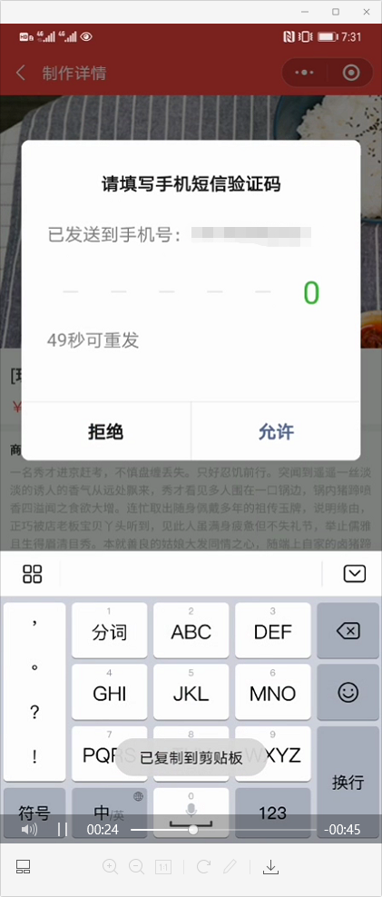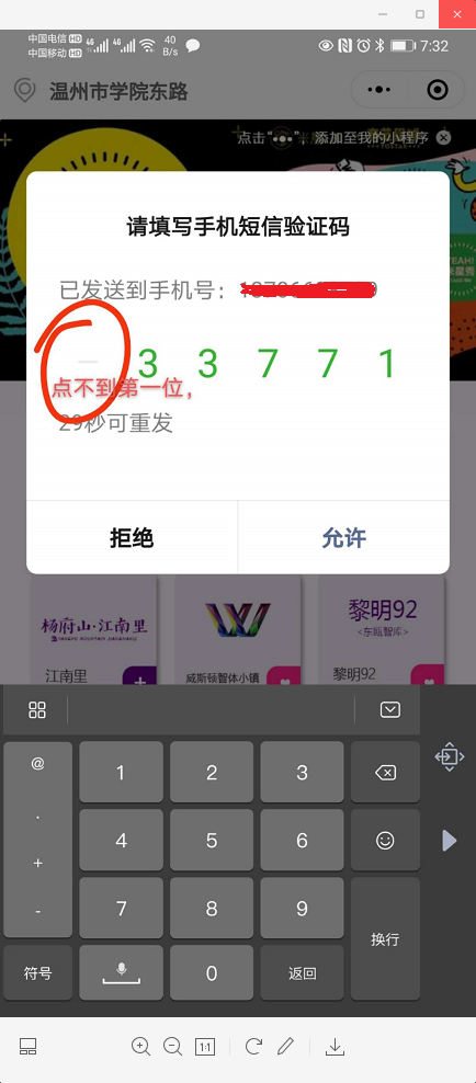 用户第一次进来,获取手机号码的时候,小程序会默认弹一个短信验证的输入框,当用户输入第一个数字的时候(有的时候不输),就会卡在这个页面,无法进行下去