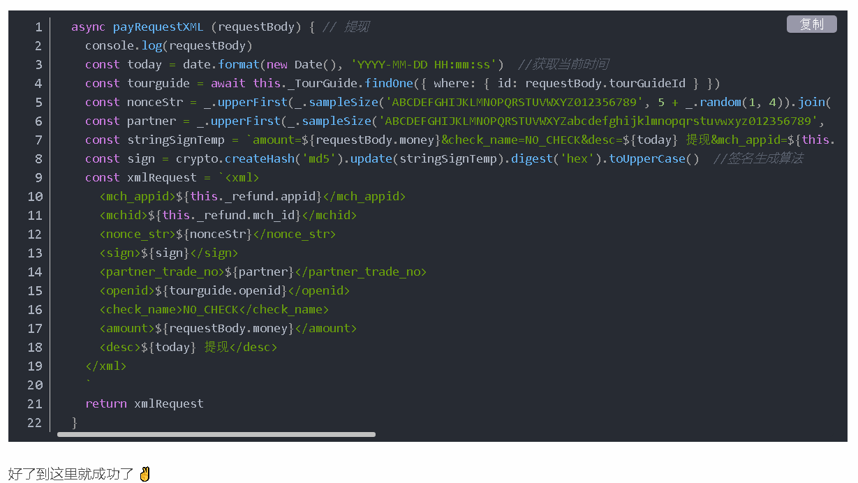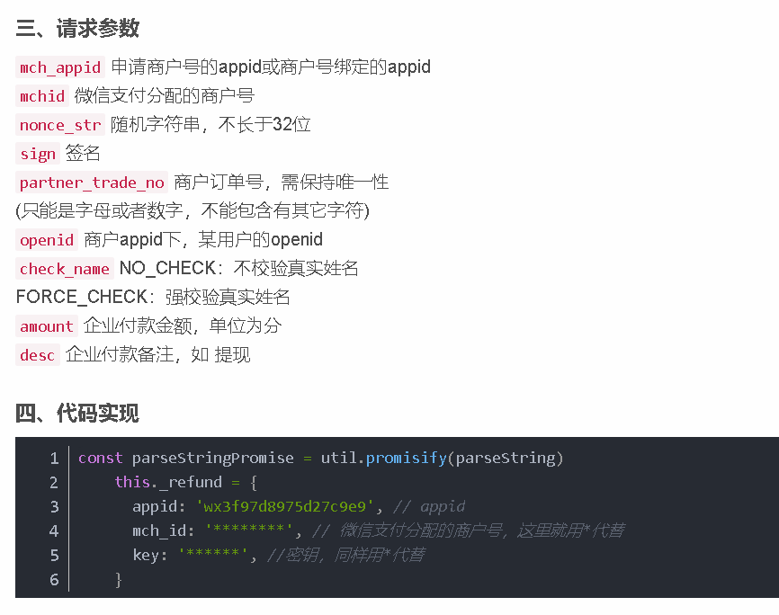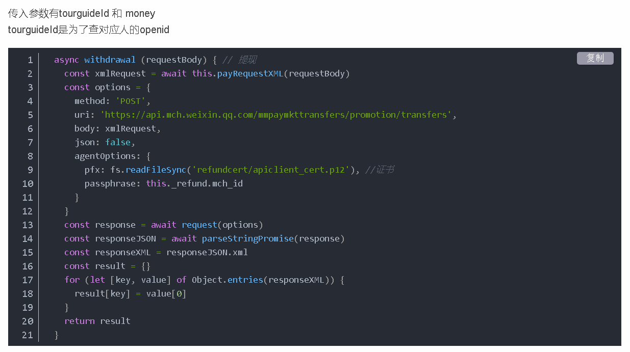 3、先找微信支付nodejs的sdk,直接调用,如果sdk里没有支付到零钱的接口,则只能自己生写原生支付代码。