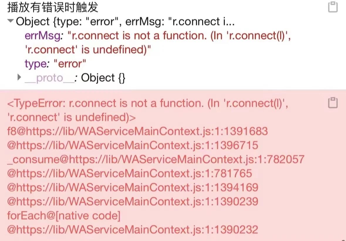播放有错误时触发 {"type": "error", "errMsg": "r.connect is not a function. (In 'r.connect(l)', 'r.connect' is undefined)"}
