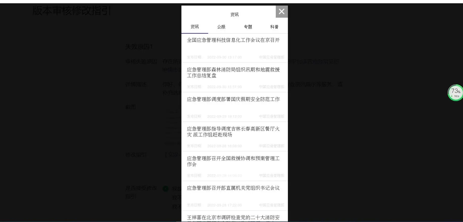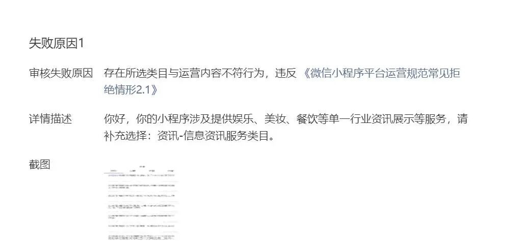 1、涉及提供娱乐、美妆、餐饮等单一行业资讯展示等服务,请补充选择:资讯-信息资讯服务类目。或自查代码,确保包括前端展示、小程序代码等整体均移除上述内容,再提交代码。(相关页面路径: pages/newsPage/newsPage.html )