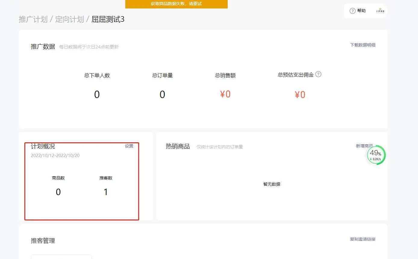 定向计划开通之后看不到添加的产品,进入计划里面就是提示我获取商品失败,这个要怎么解决?找了很多办