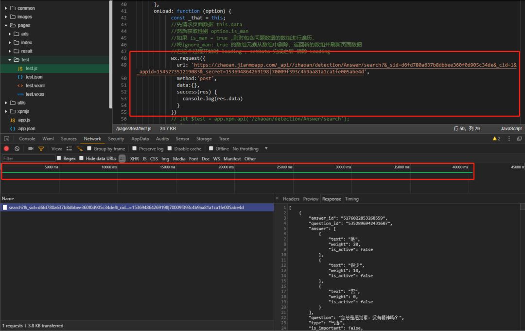 使用微信开发者工具打开包含上述post请求的页面,就会出现上述情况,当再次点击调试时(打开开发者工具时,默认会执行调试),是瞬间响应的。