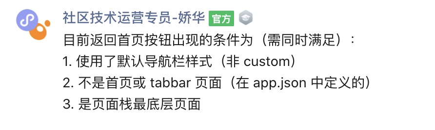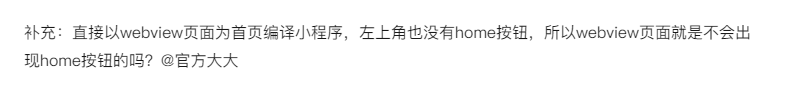 补充:直接以webview页面为首页编译小程序,左上角也没有home按钮,所以webview页面就是不会出现home按钮的吗?@官方大大