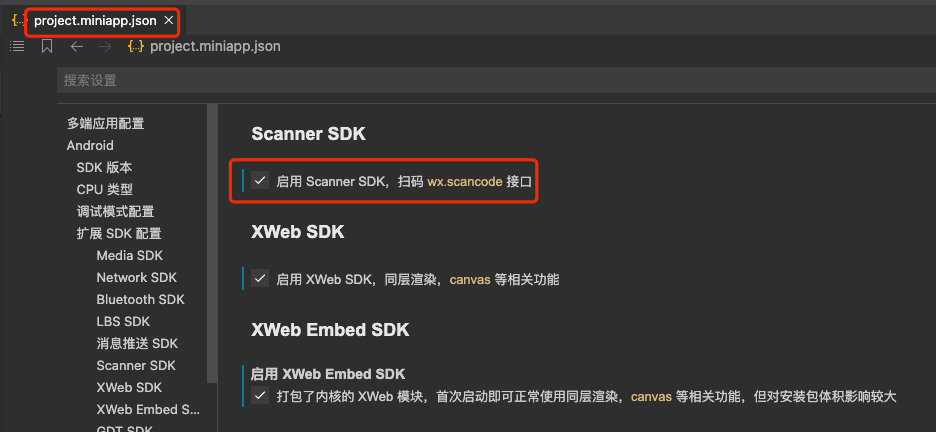 project.miniapp.json 文件里面勾选下 Scanner SDK ,再重新打包试试。