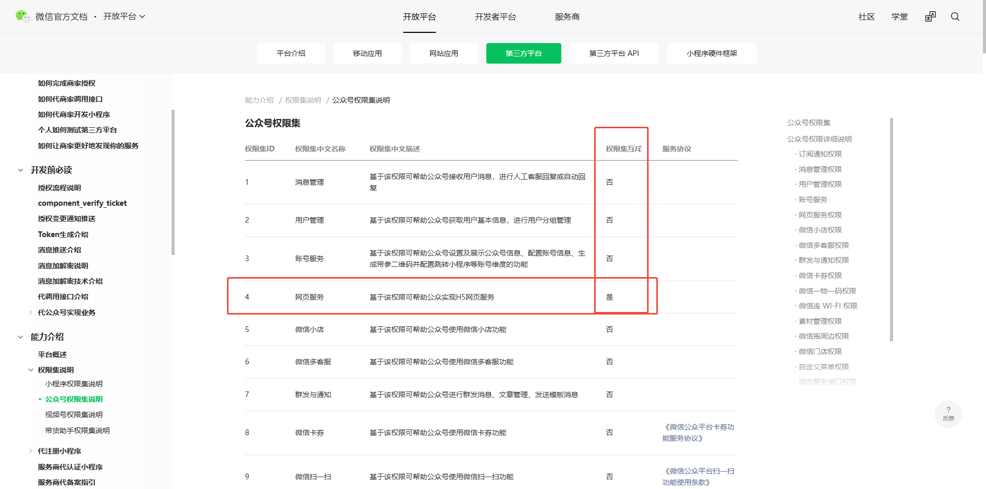 你好,互斥权限集,需要先从其他第三方平台中取消勾选【网页服务】权限集,才能重新授权给这个第三方平台https://developers.weixin.qq.com/doc/oplatform/Third-party_Platforms/2.0/product/offical_account_authority.html