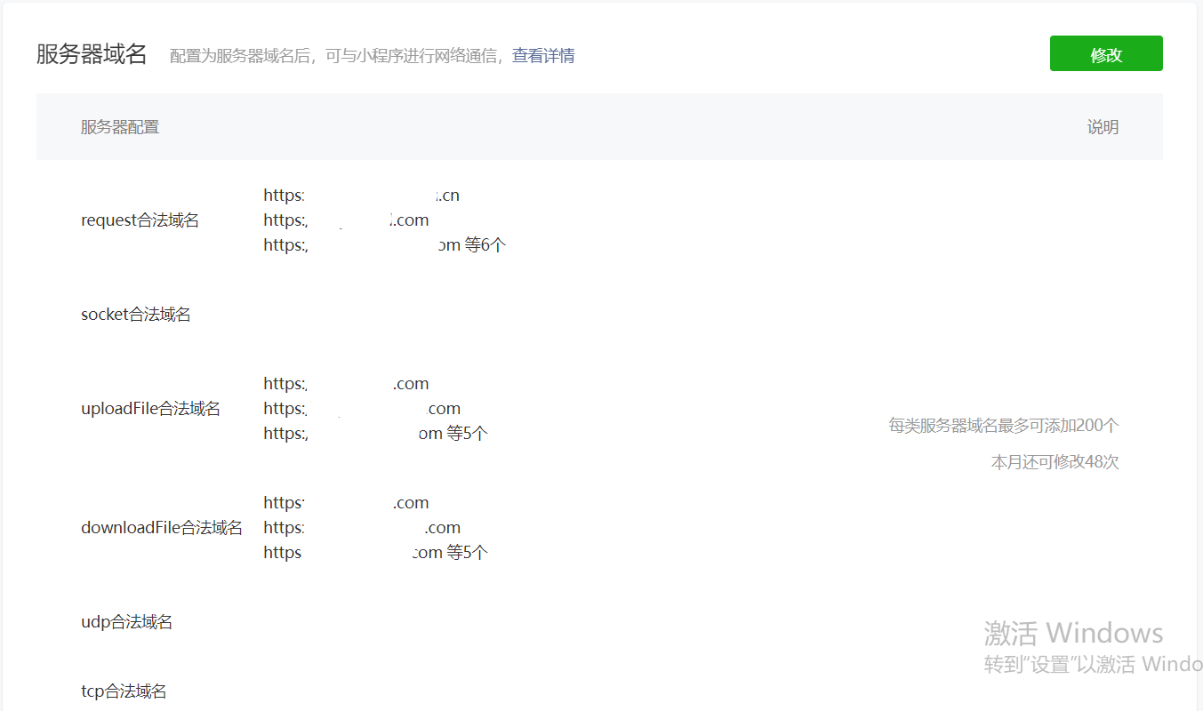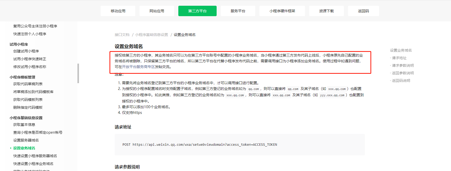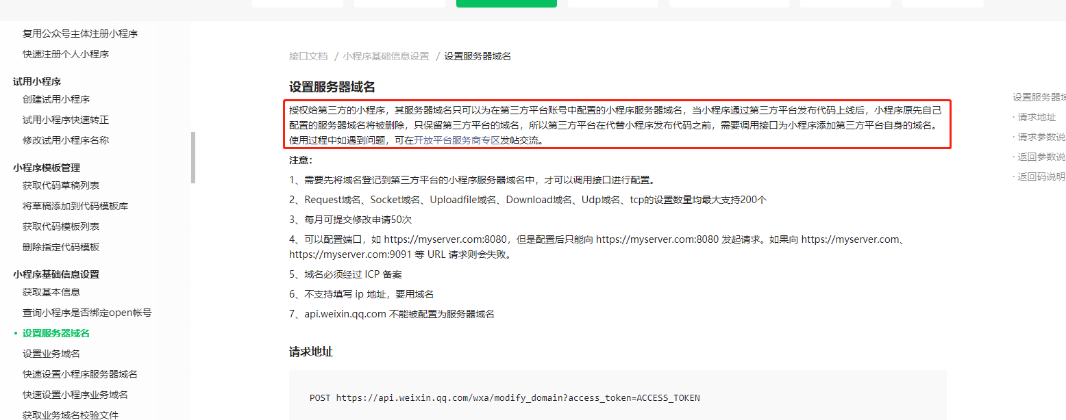 你好,可以看下接口详细说明https://developers.weixin.qq.com/doc/oplatform/Third-party_Platforms/2.0/api/Mini_Program_Basic_Info/Server_Address_Configuration.html