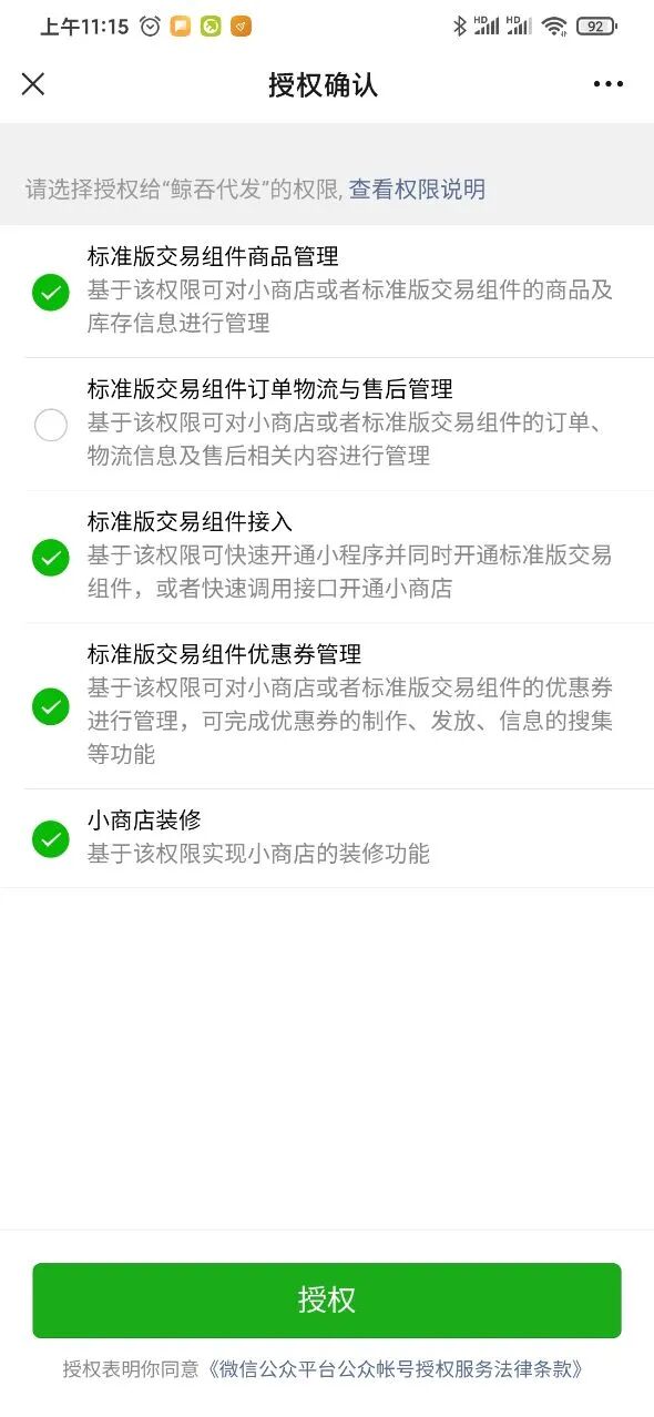 用户在服务市场上购买套餐的同时授权小商店权限集给第三方平台, 如何设置授权哪些权限集?