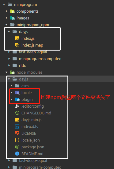 如图,使用构建npm后,在miniprogram_npm的dayjs文件夹里缺少local和plugin这两个文件夹。这是什么原因?怎么解决?