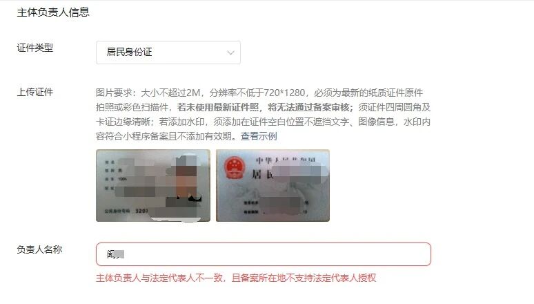 因为你的营业执照所在地的小程序主体负责人必须是法人,你上传的身份证信息不是法人