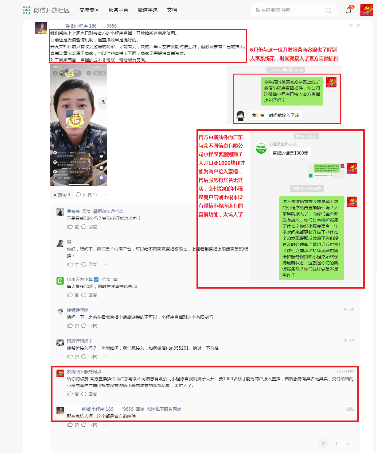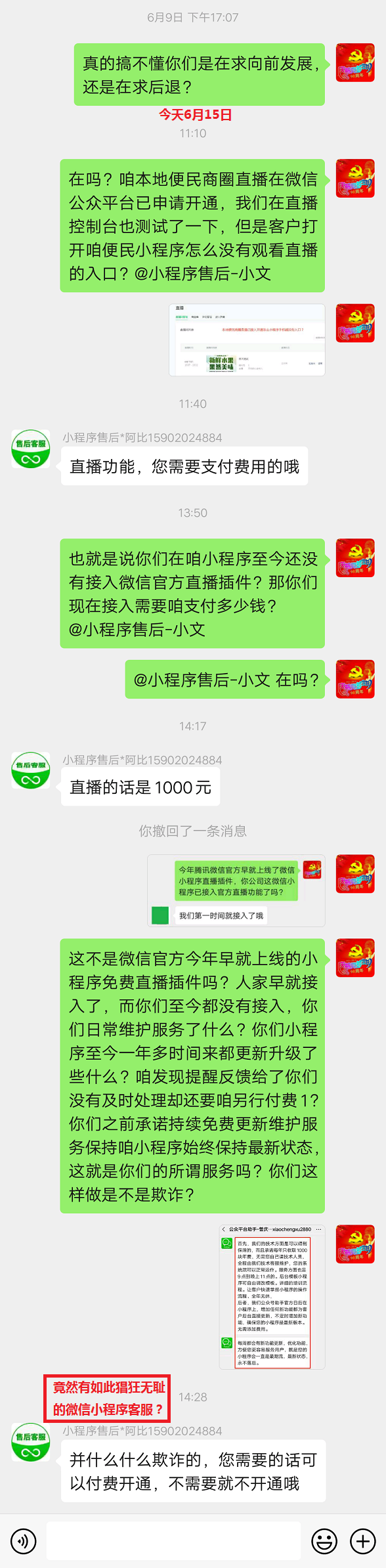 这不是欺诈交易吗?而且消耗了咱一年的时间等待和精力,如今小程序仍然是这样,微信小程序官方的赋能直播插件居然他们都能这样狮子大开口要钱,上面这些承诺忘了吗?