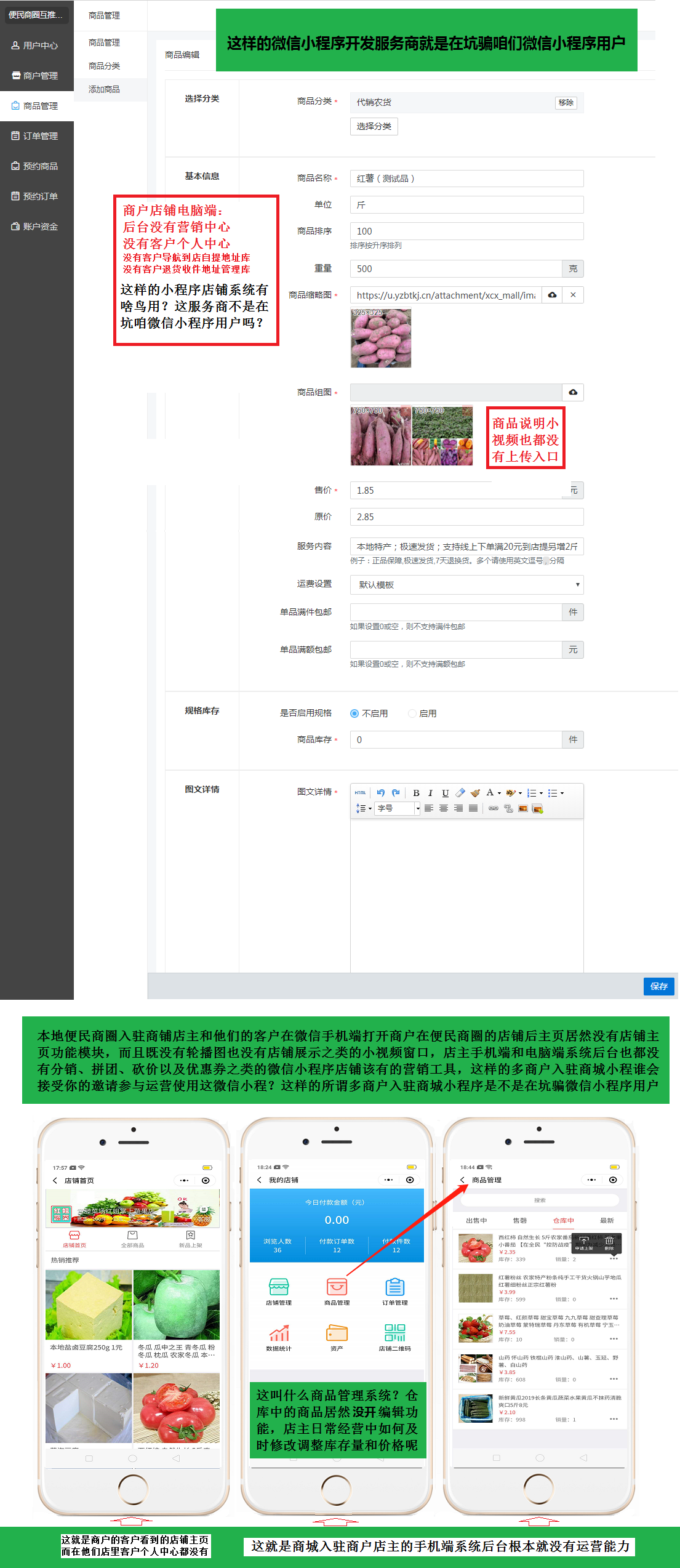 1、商品管理中心:最关键的商品编辑发布和商品编辑修改功能居然也没有,因此店铺商品价格和库存量就无法进行修改调整;例如,便利店商户库存除了客户线上下单后到线下门店自提的数据门店系统能够实时扣减库存量,但是门店内线下销量在线仓库存量是不能及时自动扣减的,因此店主就需要及时修改调整库存量或价格,以免造成不必要的超量下单所产生的麻烦;而连这个微信小程序店铺最基础的商品编辑管理功能操作面板都是一个有其名而无其实的摆设,只能对在售商品进行删除与下架和再上架的操作,这叫什么商品管理系统?微信小程就是这样赋能的吗?还是你们故意扣着功能以此要挟咱们再另行付费??