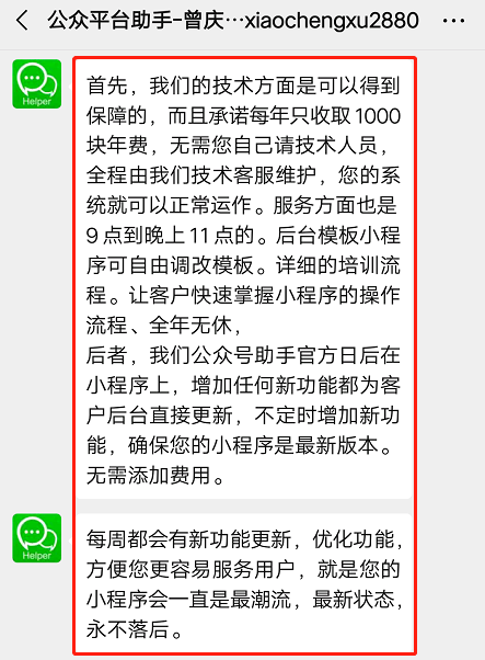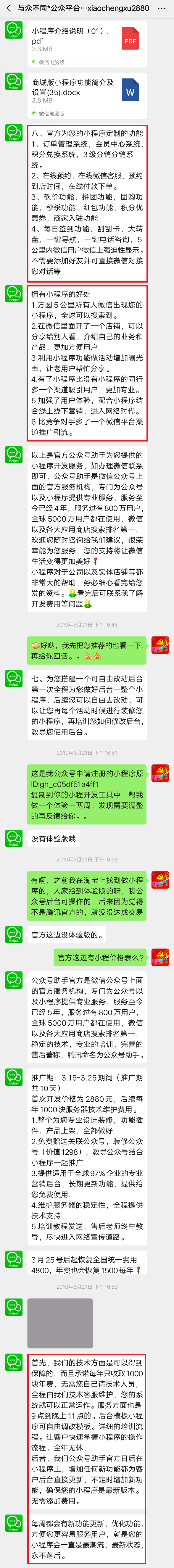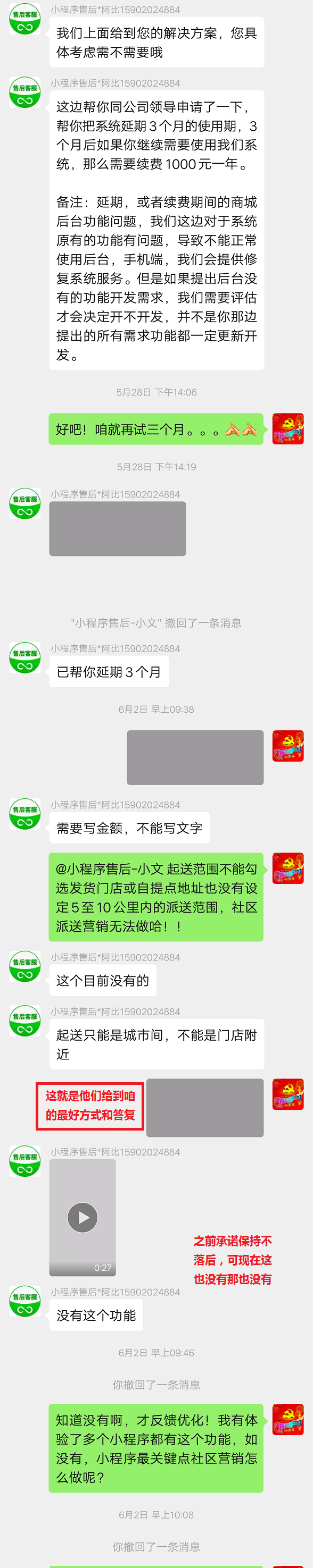 这上面是他们与咱对接开发时的承诺,而后来实际上给咱的产品和服务根本就不相符,如果迟迟不能更新达到这小程序该有的功能,那么他们这完全就是在借微信小程序开发服务商之名欺诈咱们微信用户