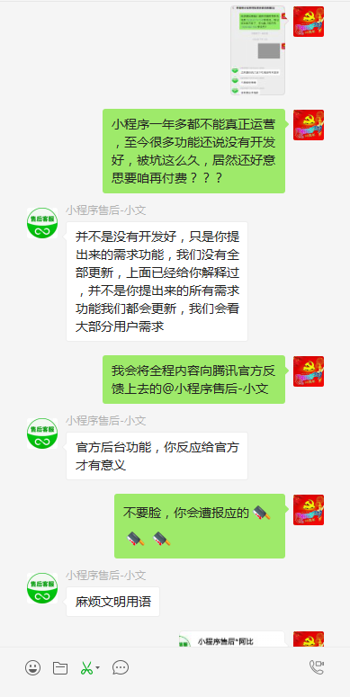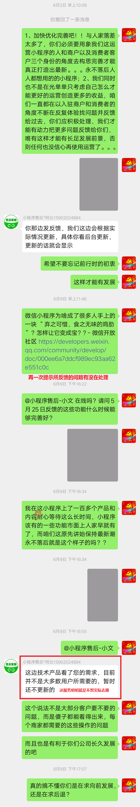 这上方截图是咱首次把在社区这发表的准备投诉内容转发给他们后,当时感觉小程序客服似乎态度有些好转,但是又经过咱这一个多月的耐心等待感觉他们仍然是没有诚意为咱这小程序处理问题,而且似乎这一个多月来他们又可能公关了腾讯方面的相关人脉,现在却变得更加肆无忌惮了。。。