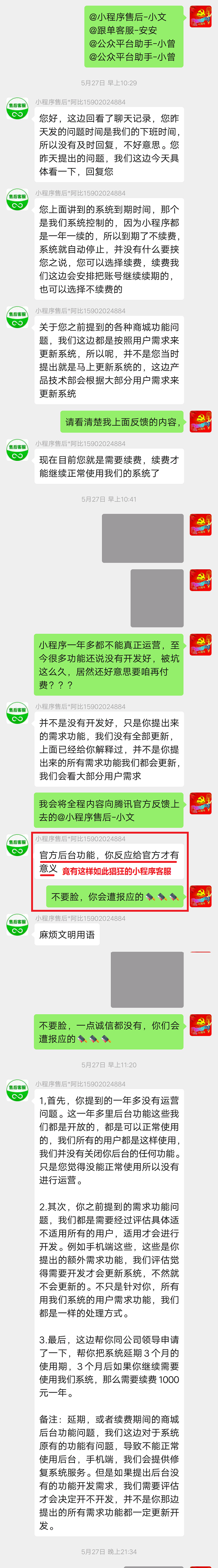 咱们把身份证、营业执照、个人资料、甚至是银行卡这些资料全都信任的提供给了你们,你们好意思借微信小程序第三方开发服务商的名头唬弄咱们吗?唬弄咱一年多,使咱(本地便民商圈)微信小程序一直不能真正对外推广运营,而且前不久在5月份还以关停咱小程序系统后台管理登录来要挟咱续费让他们继续为咱提供这有其名无其实的维护更新服务,这是什么强盗逻辑!!