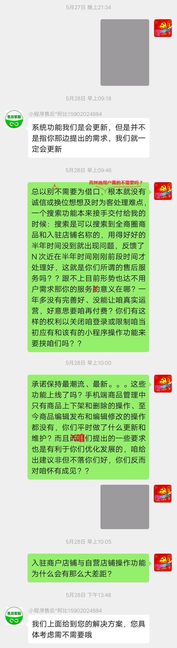 尊敬的腾讯官方客服:广东与众不同信息科技有限公司给咱这便民商圈微信小程序圈主运营者系统后台也没有可为入驻商户店铺开通相关营销功能的操作,那么谁又愿意和咱一起来参与微信小程序运营呢?又怎么能尽快让更多人用上微信小程序赋能更多实体店,使更多普通民众用上微信支付呢?以上一些问题咱一年多来发现所谓的开发服务商的业务对接人员和客服人员前后态度差距太大,咱遇到这些需要调整或完善的地方他们根本没有诚意给你及时解决,交付给的商城小程序店铺营销能力根本不是他们之前所描述的那样;咱亲朋好友入驻店铺运营能力与咱圈主自营店铺营销功能差别太大,咱系统后台仍没有为他们开通相关营销工具的操作,他们店铺根本就没有微信小程序店铺线上应有的运营能力;因此,咱再好的朋友谁又愿意参与运营使用呢?如果就咱个人小程序自营单店运营又能又多少资源起步发展运行微信小程序呢?何况咱定制开发的也不是单店小程序;他们如此的不守诚信当初交付给咱的商城小程序根本就没达到当初对接时所描述的样子,而咱等待了一年多他们根本就没有什么维护更新优化,至今仍没有达到一个商城商圈微信小程序应有的营销能力,而淘宝、京东、拼多那么成熟的平台咱不上去,人家为什么要花钱、花时间和精力来投入微信小程序运营?因为咱们看中的是微信小程它所具有的真实能力。。。作为开发服务商请看一下当初你们业务员是对咱们如何描述和承诺的,难道都忘了吗?请你们真诚的对待把信任交给你们的微信用户吧!! 每人的忍耐都是有底线的。。。