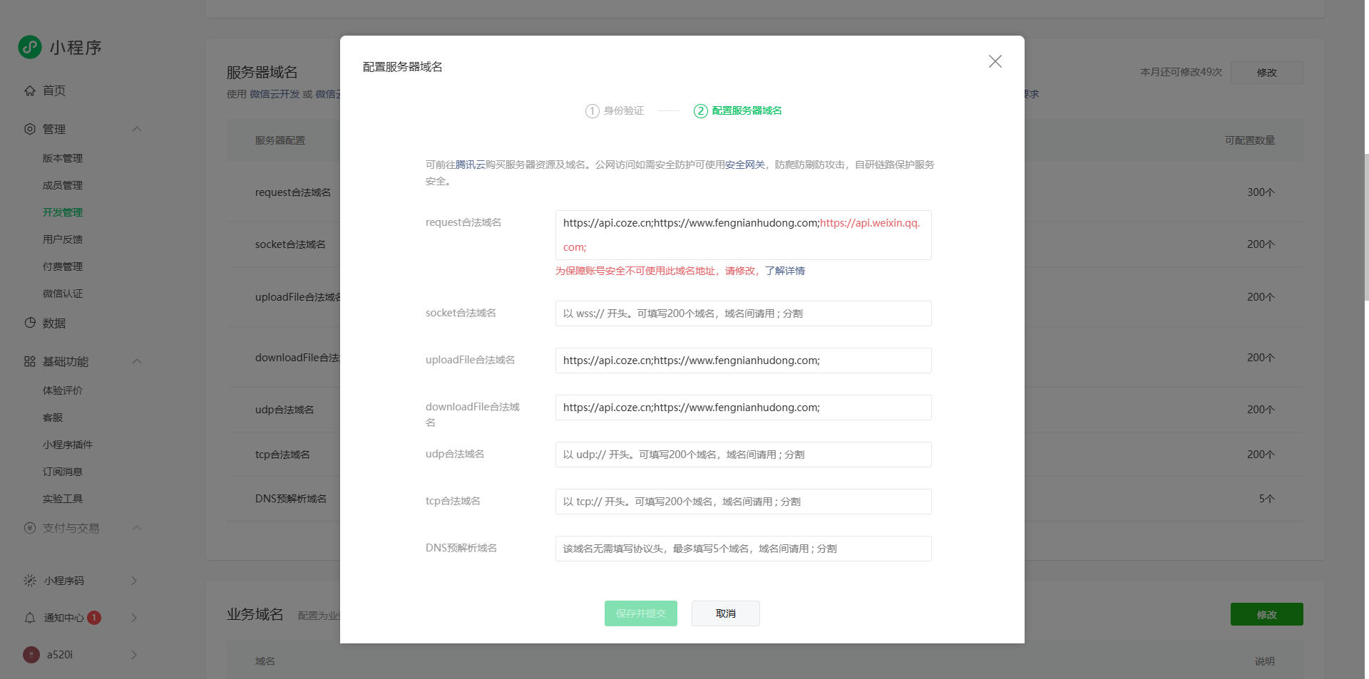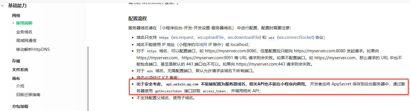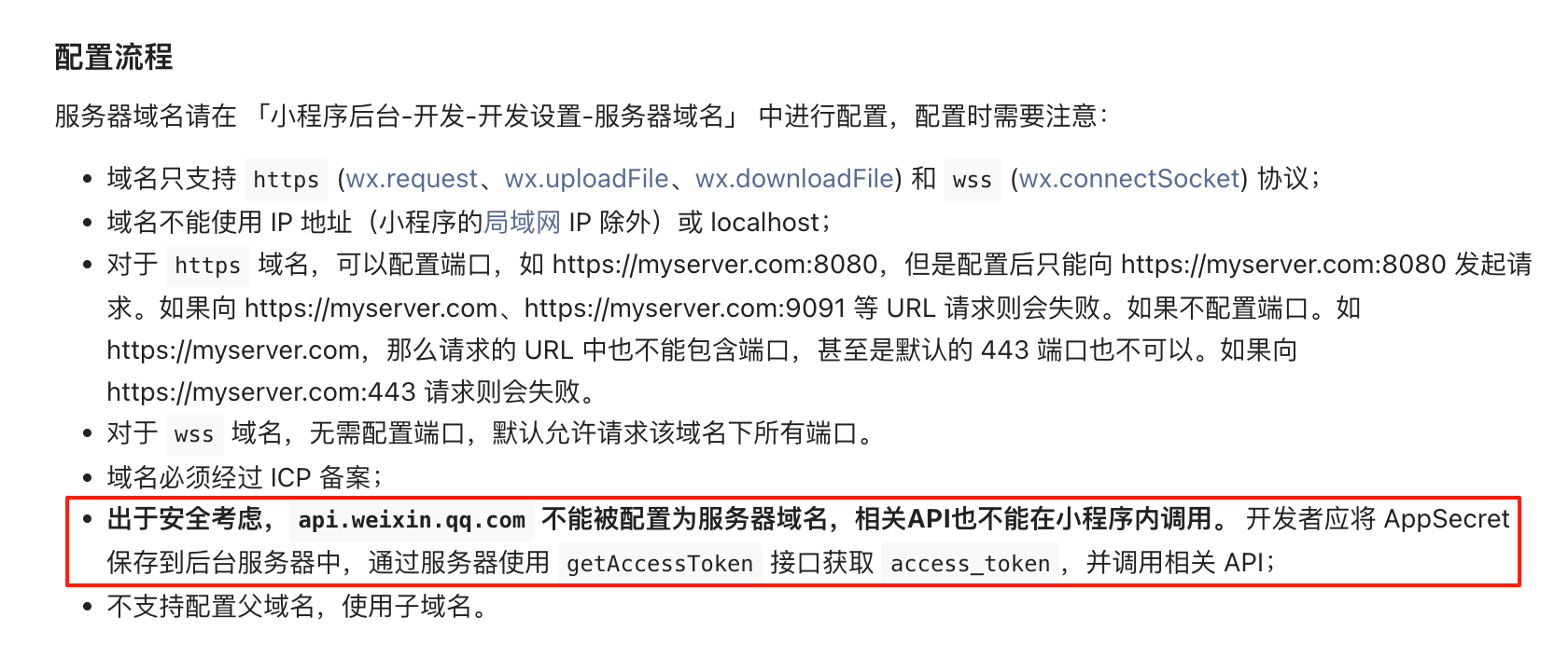 出于安全考虑,api.weixin.qq.com 不能被配置为服务器域名,相关API也不能在小程序内调用。